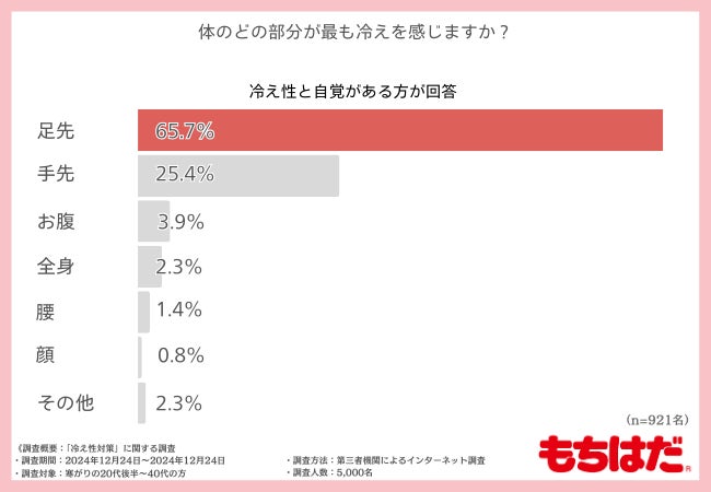 次に、冷え性の方々に『体のどの部分が最も冷えを感じますか?』と聞いたところ、「足先(65.7%)」と約3人に2人は足先に冷えを感じていることがわかりました。