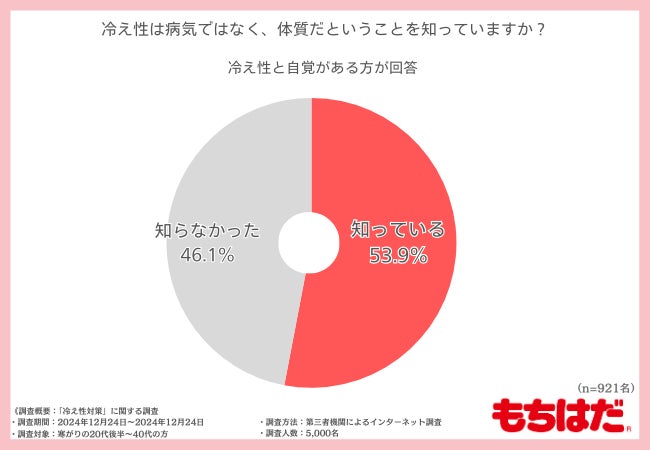 そこで、『冷え性は病気ではなく、体質だということを知っていますか?』と聞いたところ、体質であると知っている方は約半数の53.9%で、残りの方は体質であるということを知らなかったという結果になりました。