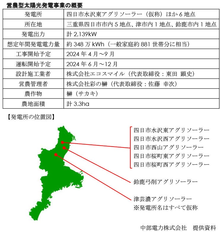 本事業は、三重県内の荒廃農地や遊休農地を活用するため、約二年前からエコスマイル、中部電力および株式会社彩の榊(本社:東京都青梅市、代表取締役社長:佐藤 幸次(さとう こうじ)、以下「彩の榊」)の三者で検討してきたものであり、今回、営農型の高圧太陽光発電設備を合計7か所(四日市水沢東アグリソーラー・四日市水沢西アグリソーラー・四日市西山アグリソーラー・四日市桜町東アグリソーラー・四日市桜町西アグリソーラー・鈴鹿弓削アグリソーラー・津芸濃アグリソーラー※発電所名はすべて仮称)についてエコスマイルが施工を担当し、中部電力の事業会社が所有・運営するものです。