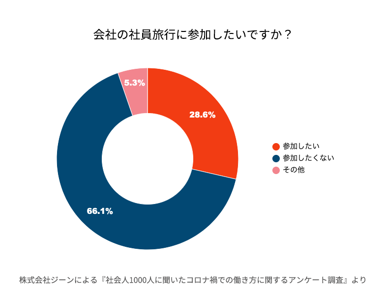 『会社の社員旅行に参加したいですか?』という質問に対し、「参加したくない」と答えた人が66.1%で最も多く、「参加したい」と答えた人は28.6%でした。「場所によっては参加したい」や「メンバーによっては参加したい」などの条件付き参加者も少数いました。
