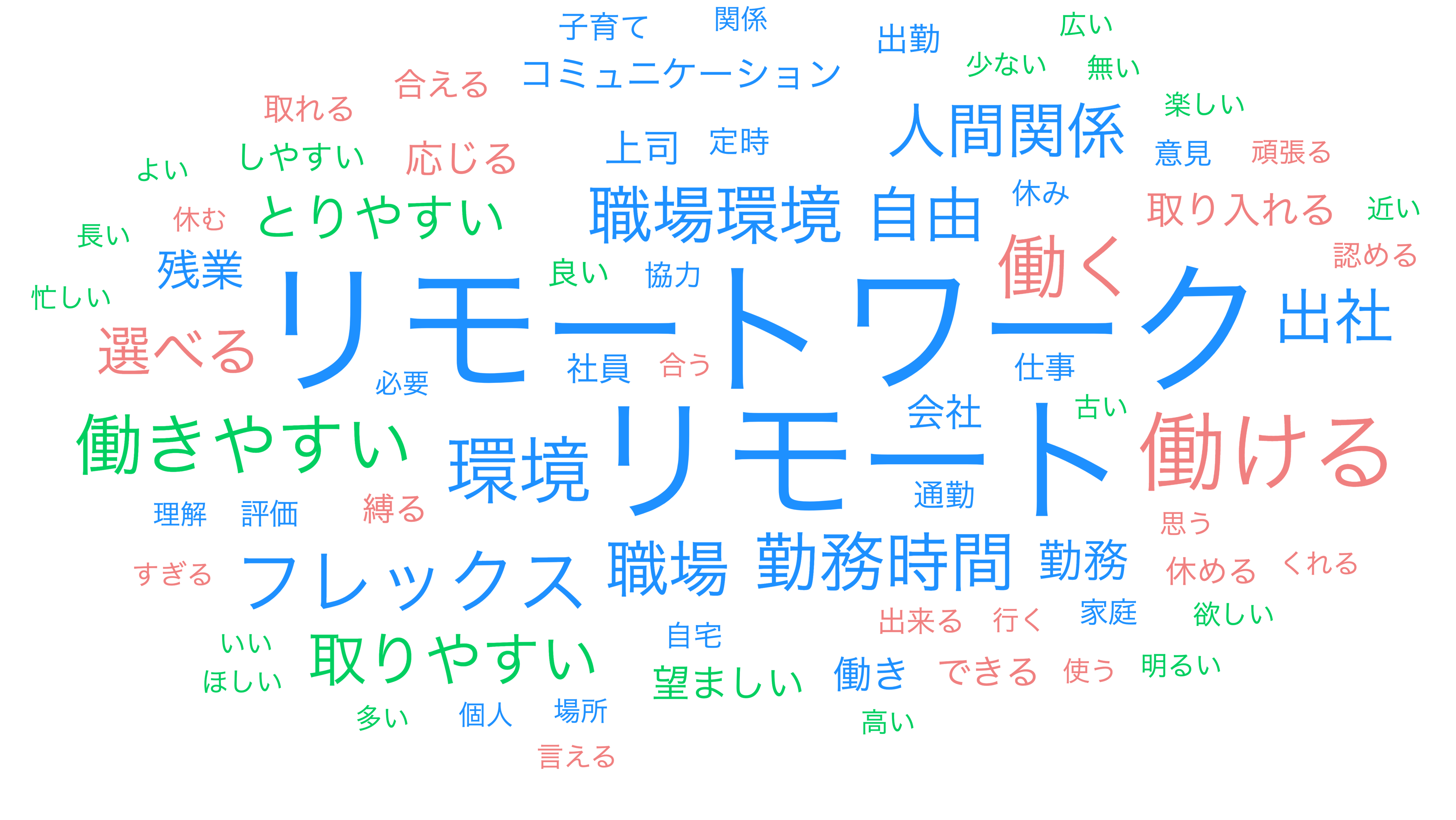 自由記述の傾向として、適度なリモートワークやフレックス制度の導入といったある程度自由度があり自分のペースで仕事ができる環境が理想的な働き方と考えている人が多かったです。