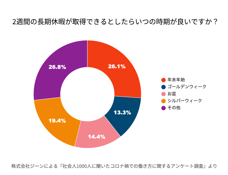 『2週間の長期休暇が取得できるとしたらいつの時期が良いですか?』という質問に対し、「年末年始」が最も多く26.1%、次いで「シルバーウィーク」、「お盆」、「ゴールデンウィーク」という順番になりました。
