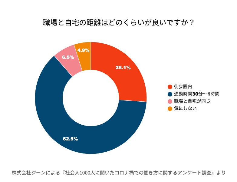 『職場と自宅の距離はどのくらいが良いですか?』という質問に対し、「通勤時間30分〜1時間」と答えた人が最も多く62.5%、「徒歩圏内」と答えた人は26.1%でした。
