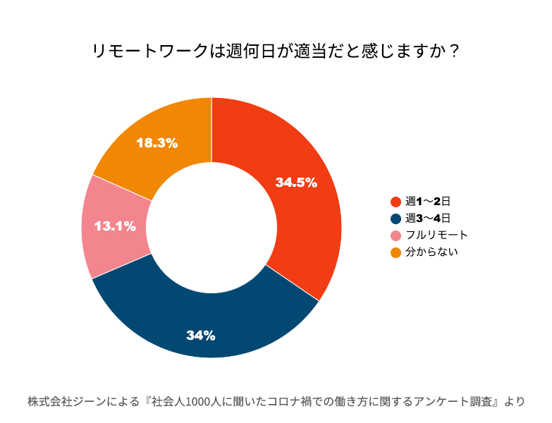 『リモートワークは週何日が適当だと感じますか?』という質問に対し、「1日以上のリモートワークを希望する」と答えた人が全体の81.6%でした。一方、フルリモートを希望する人は全体の13%で、多くの人がリモートワークと出社のハイブリッド型を希望しているようです。