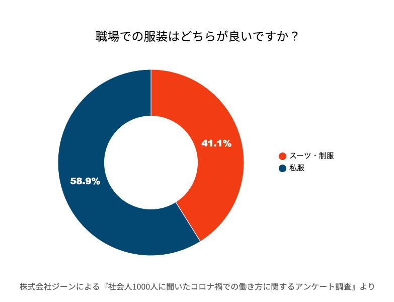 『職場での服装はどちらが良いですか?』という質問に対し、「私服」と回答した人が58.9%、「スーツもしくは制服」と答えた人が41.1%という結果になりました。