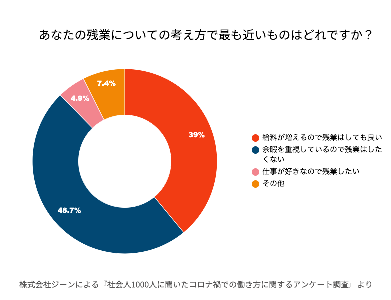 『あなたの残業についての考え方で最も近いものはどれですか?(自由回答を含む)』という質問に対し、「余暇を重視しているので残業はしたくない」と答えた人が48.7%で最多で、続いて「給料が増えるので残業はしても良い」が39%、「仕事が好き(スキルアップしたい)なので残業したい」が最も少なく4.9%でした。