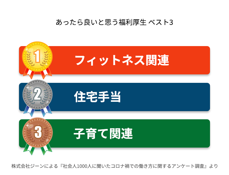 自由記述回答で、『あなたの働く会社で、あったら良いと思う福利厚生を記入してください。』という質問に対し、スポーツジムの利用に関する補助などのフィットネス関連と、社宅制度や家賃補助などの住宅手当、子どもの急な体調不良に対応できる休暇や子どもの学校行事休暇などの子育て関連の福利厚生を答えた人が多数でした。