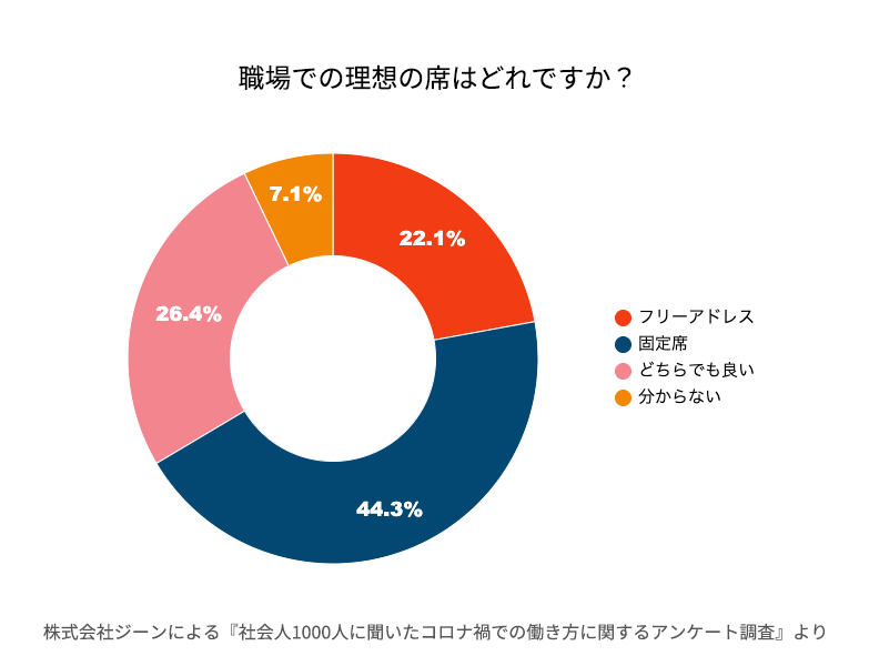『職場での理想の席はどれですか?』という質問に対し、「固定席」が44.3%で最多、続いて「どちらでも良い」が26.4%、「フリーアドレス」が22.1%という順番でした。
