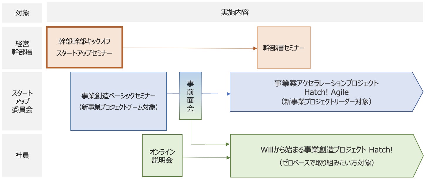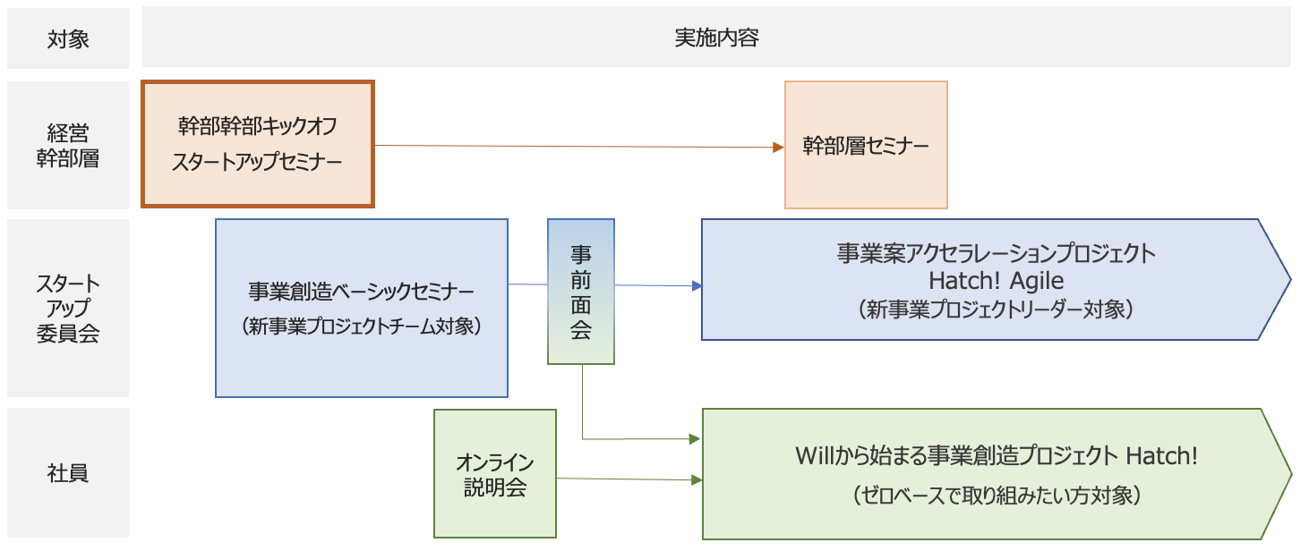 | 実施内容 | ・経営幹部層の事業創造に対する問題意識の共有 ・既存事業と異なる新規事業の方法論理解 ・事業創造を進めていくための自社課題の明確化 |
