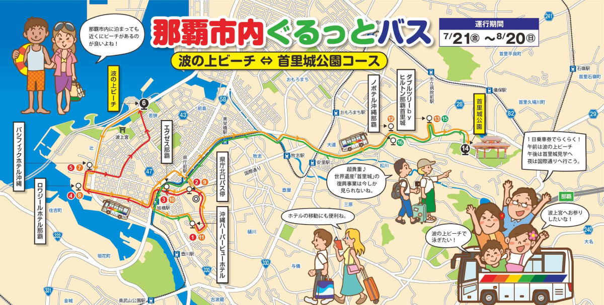 ・停車地(9ヶ所):沖縄ハーバービューホテル/県庁北口バス停/エグゼス那覇/ロワジールホテル那覇/パシフィックホテル沖縄/波の上ビーチ/ノボテル沖縄那覇/ダブルツリーbyヒルトン那覇首里城/首里城公園