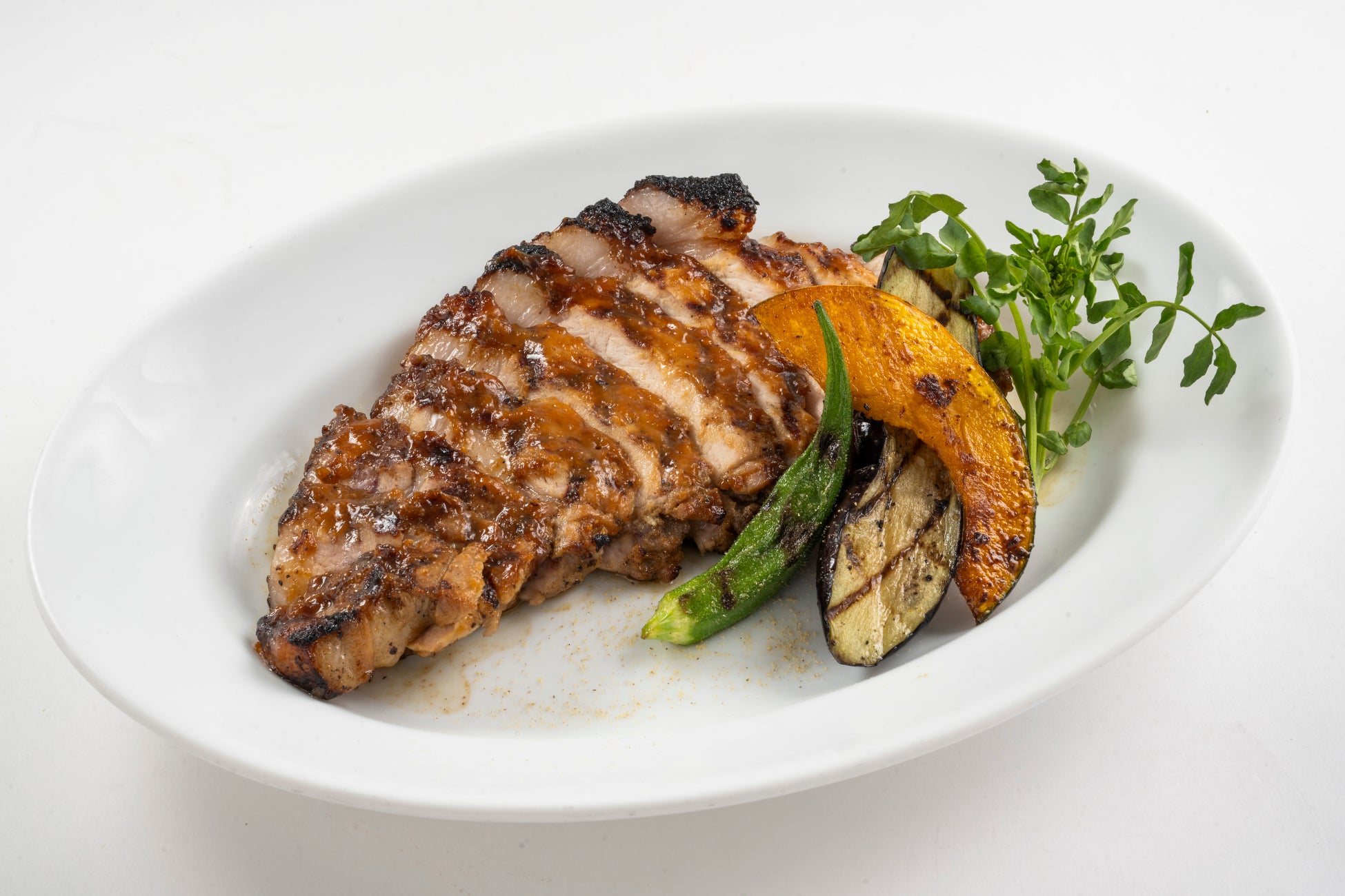 一度グリルした豚のロースにこってりした甘さの江戸味噌を使ったソースを塗り、さらに香ばしく焼き上げました。