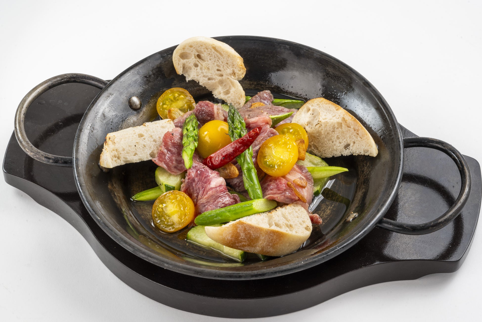程よくサシの入った常陸牛サーロインと旬のフレッシュな夏野菜を贅沢なアヒージョ仕立てに。