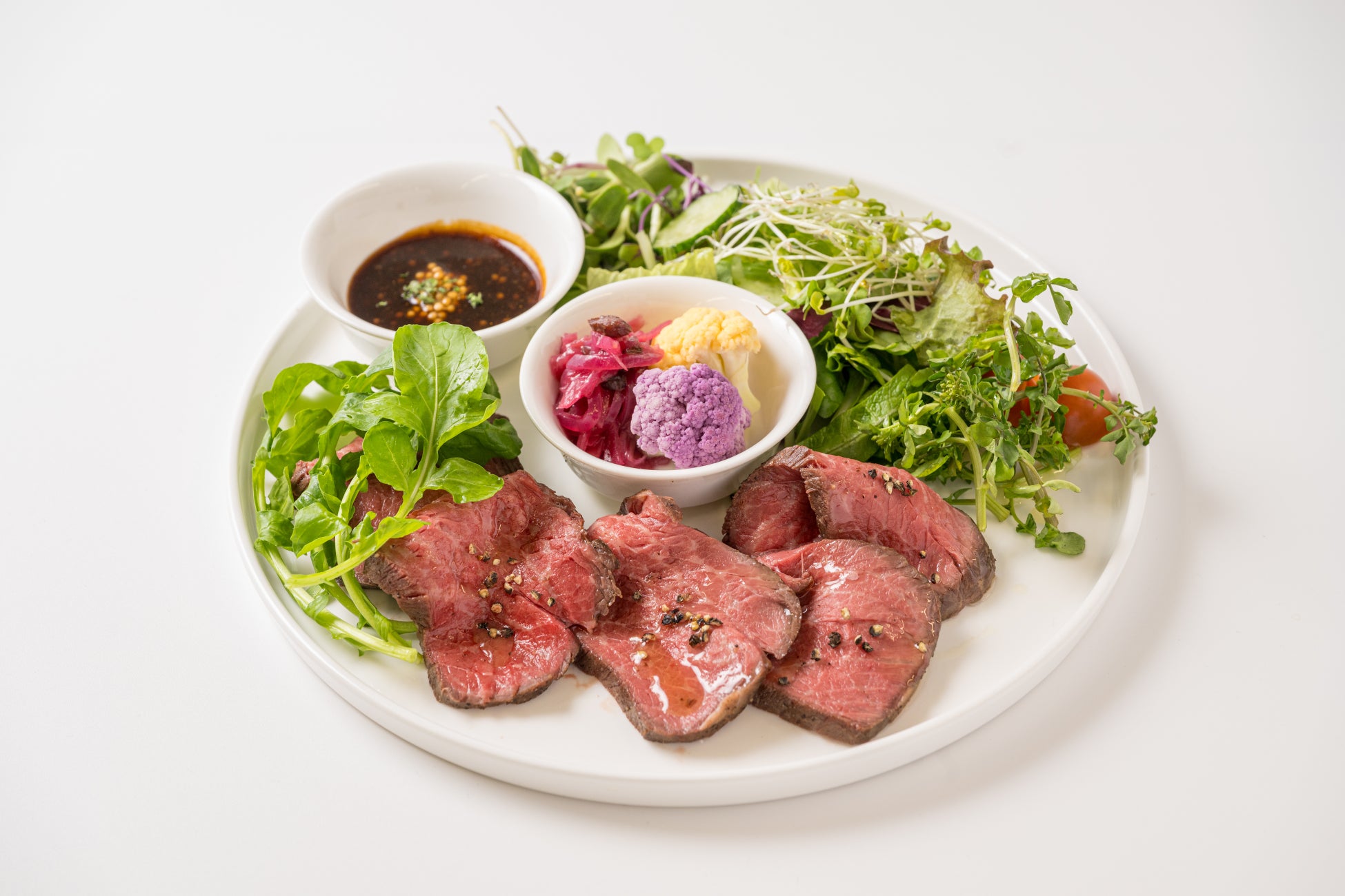 常陸牛のモモ肉をハーブとニンニクでマリネし、低温で3時間じっくりロースト。