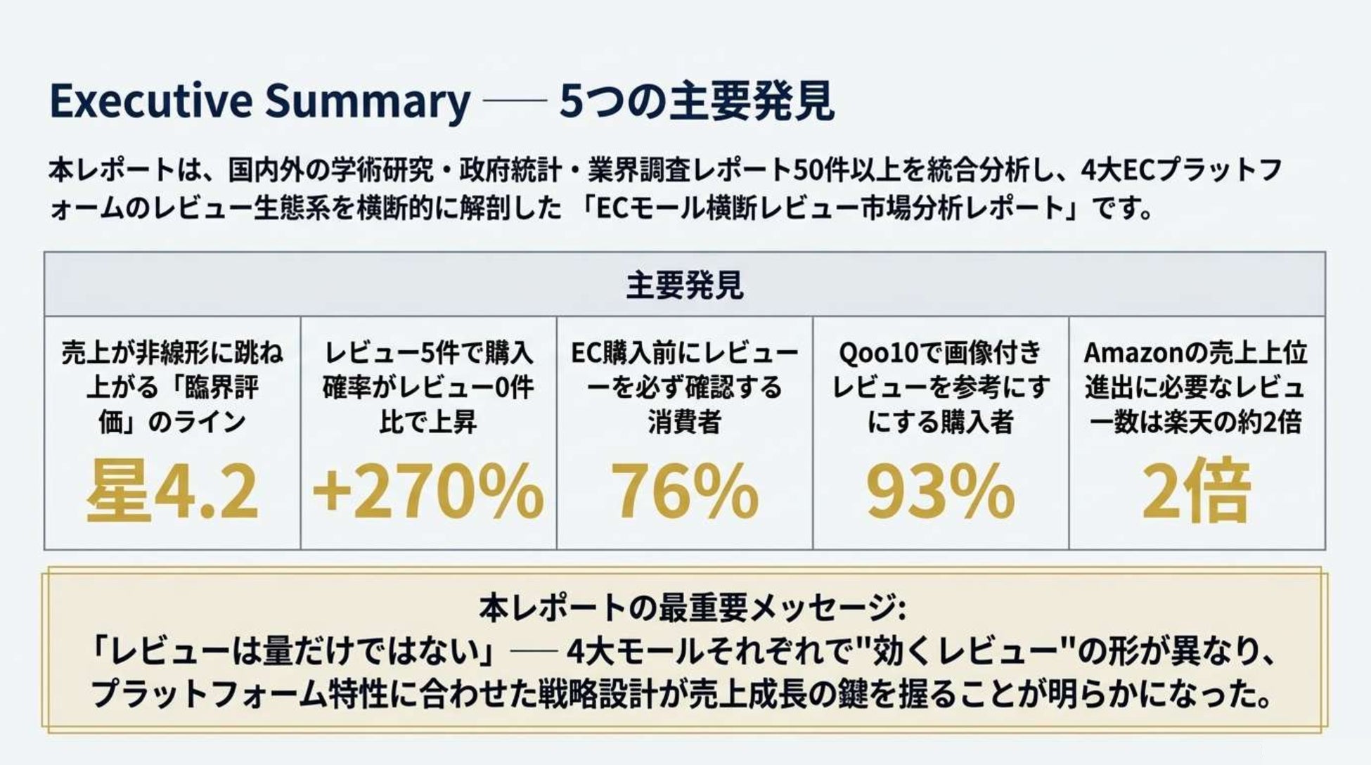 本レポートは、国内外の学術研究・政府統計・業界調査レポート50件以上を統合分析し、「売れる商品」に共通するレビューパターンを定量的に解明したものです。