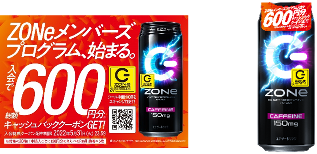 本サービス開始を記念して、対象の「ZONe」 1本(1ポイント)購入ごとに、120円分のキャッシュバッククーポン(えらべるPay引換券)×5枚が必ずもらえるキャンペーンも展開します。