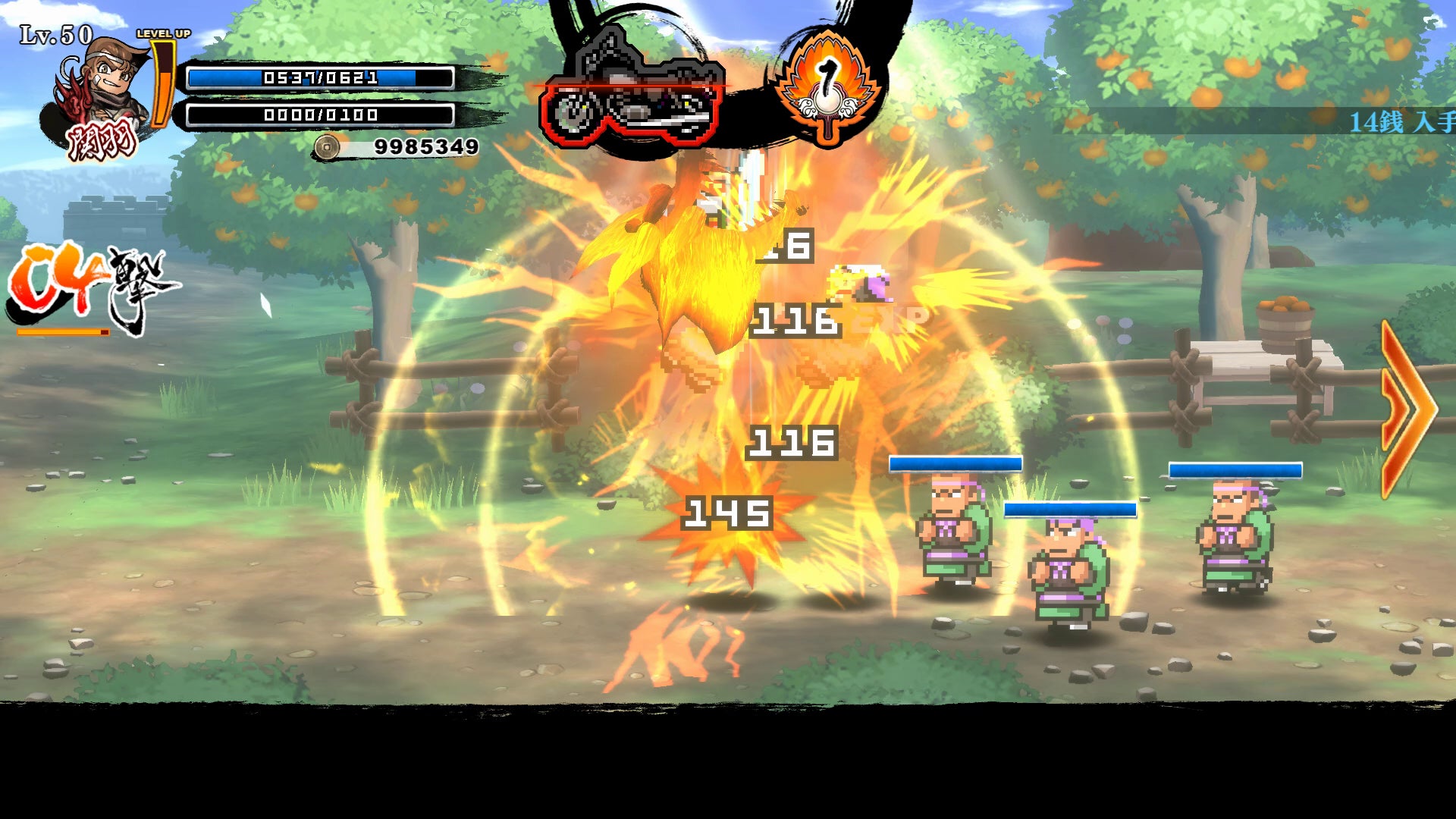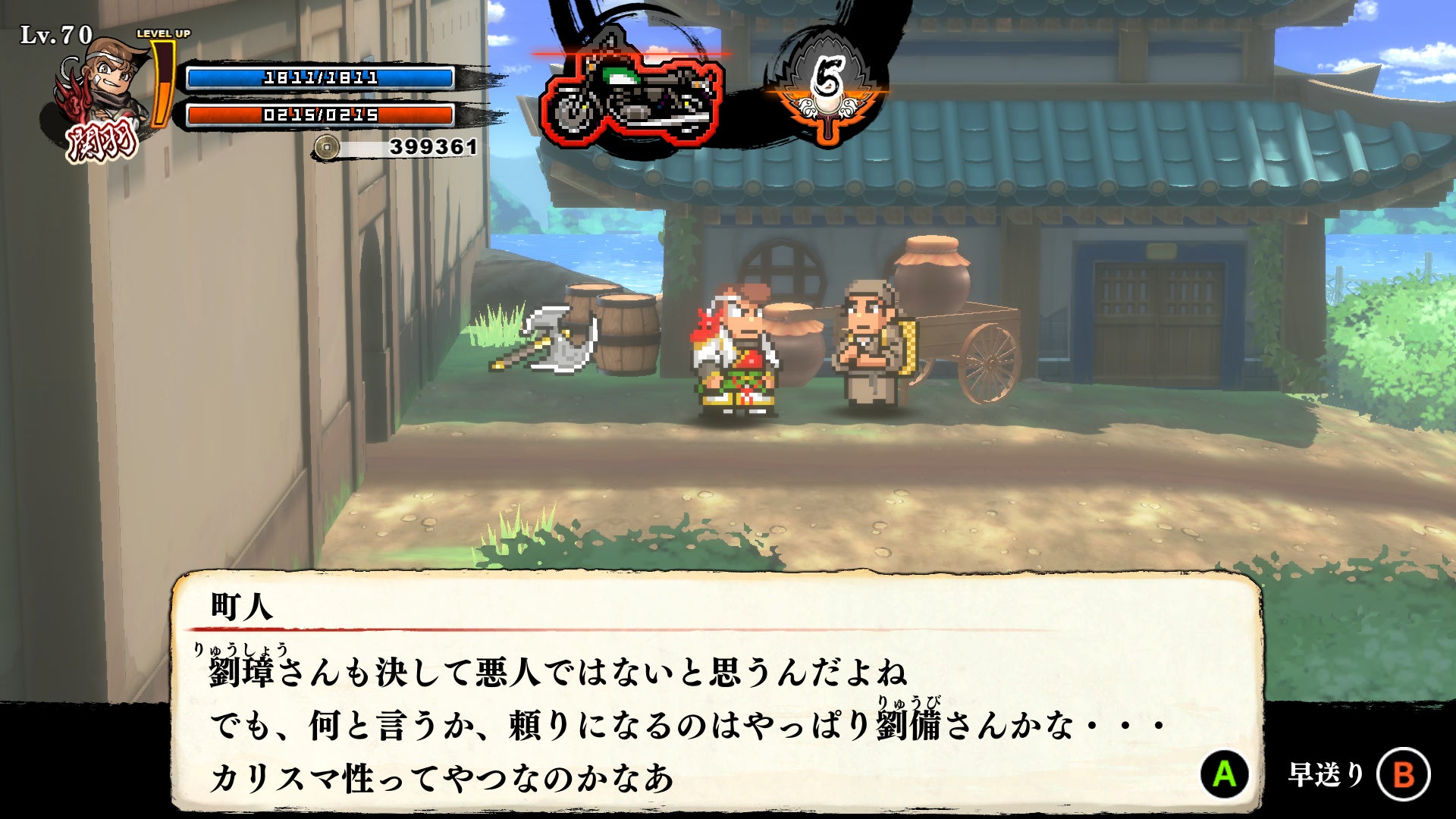 本作は「赤兎馬」(バイク)に乗ってステージ移動が可能。道中に出現する敵は問答無用に跳ね飛ばして進もう。