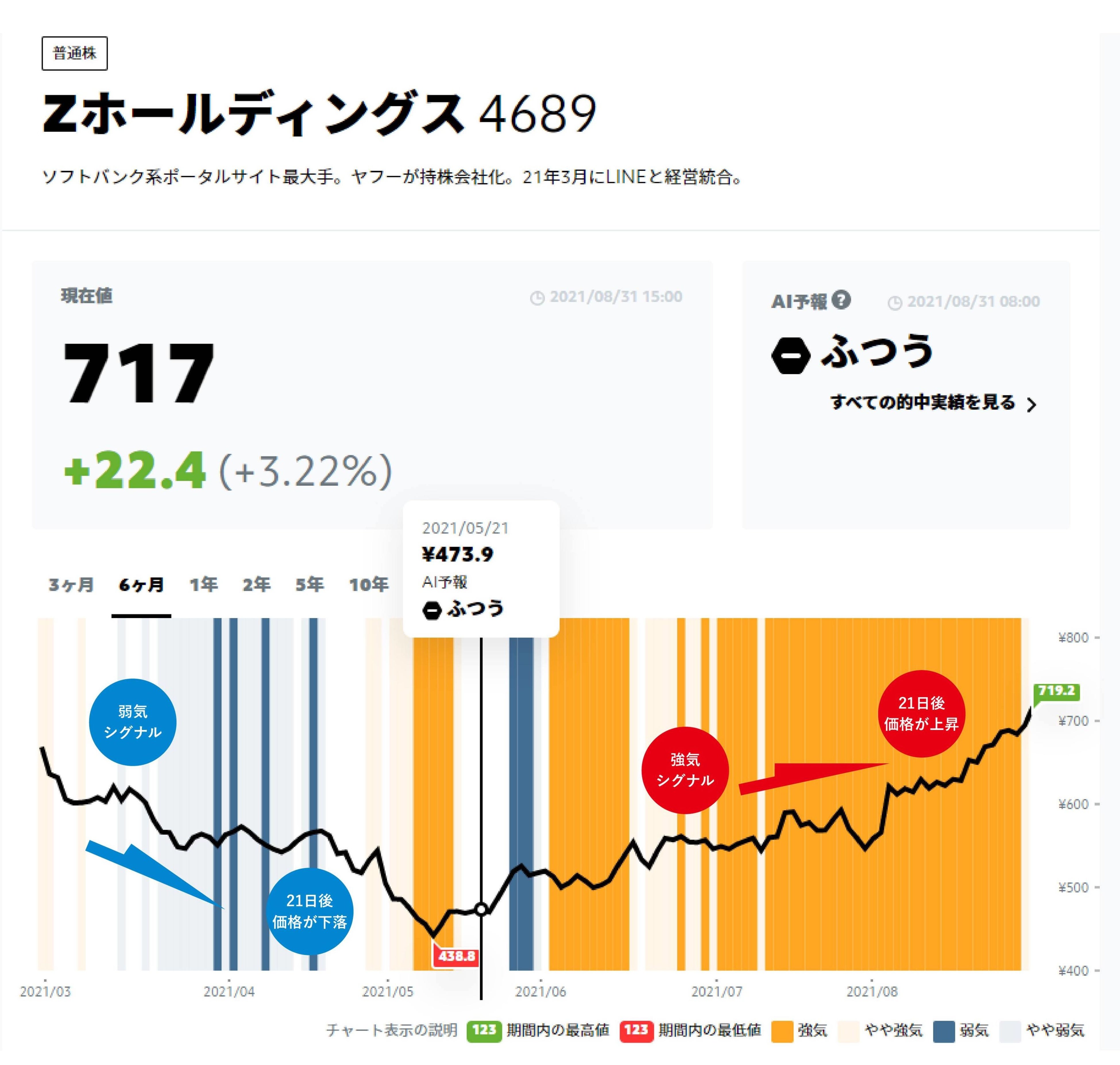 銘柄売買のタイミングはAIシグナルによってお知らせ。「1ヶ月後(21営業日)に価格が上がる」とAIが予想すると、「強気シグナル」が表示、「1ヶ月後(21営業日)に価格が下がる」とAIが予想すると、「弱気シグナル」が表示されます。