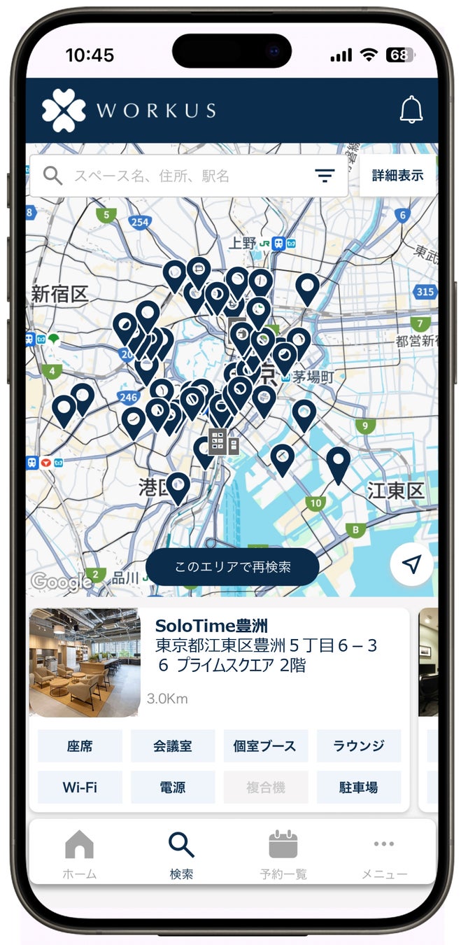 オファーズが提供するWORKUSは、日本全国約90のブランドの多様なコワーキングスペースをいつでも、どこでも、スマートフォンで予約・利用できます。