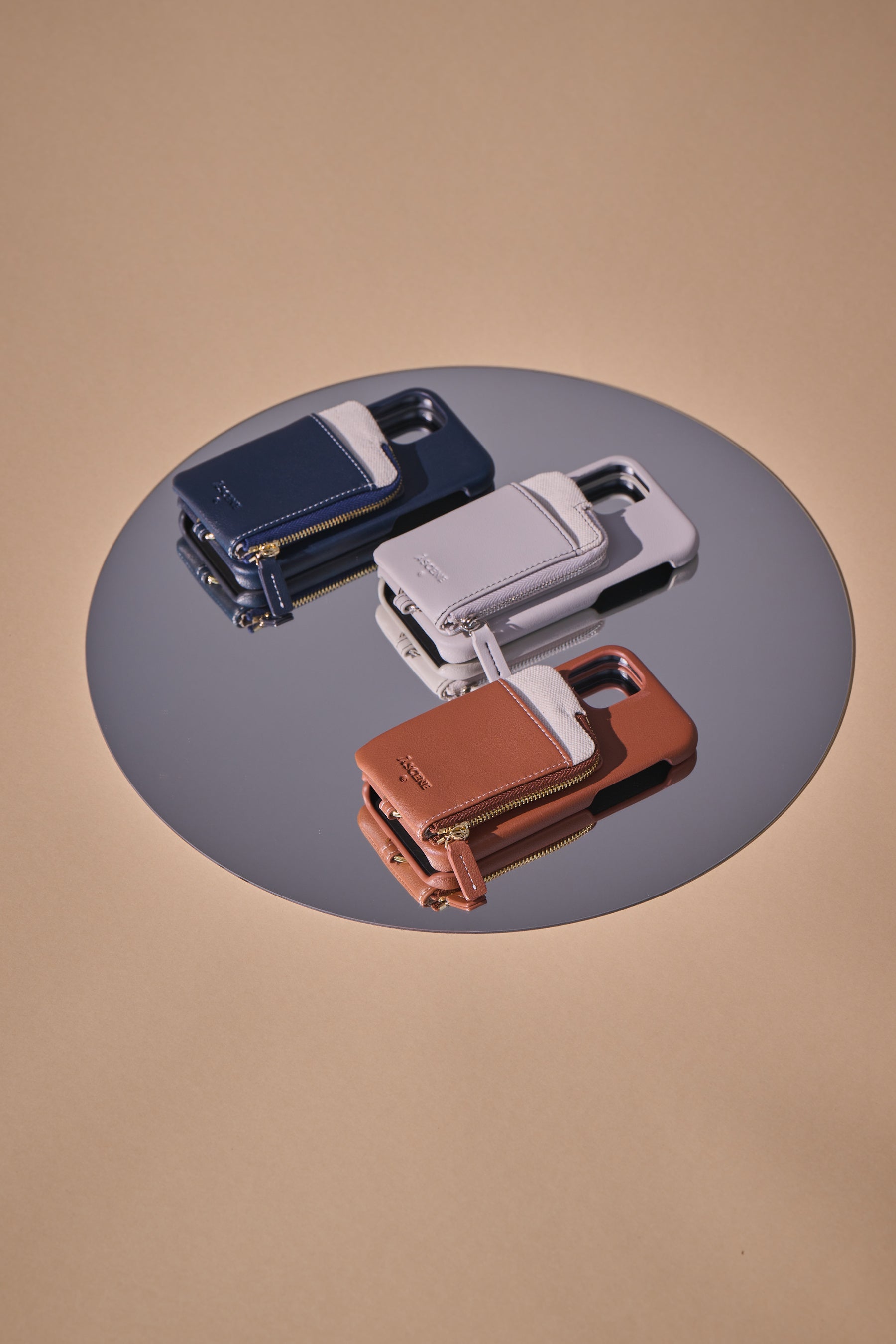 ハリのあるヴィーガンレザー(PUレザー)に、着せ替え可能なポケット、ショルダーストラップがついたiPhoneケース。リップやカードなどが入るサイズのポケットはスナップボタンで取り外し可能。ナチュラルな帆布素材をアクセントとして使用することで、デザイン性を持たせました。ショルダーストラップとポケットにはステッチでメリハリを。また、Navy / Brownはゴールドの金具を、Light Grayにはシルバーを使用。きれいめカジュアルな服装にピッタリなケースです。