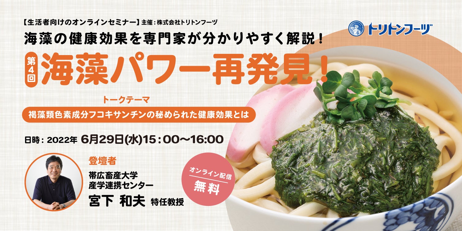 株式会社トリトンフーヅ(本社:熊本県宇土市城塚町169-1、代表取締役社長:髙木 良樹、以下トリトンフーヅ)は、排塩・免疫力UPなど、海藻の健康効果を専門家が解説する全6回のオンラインセミナー「海藻パワー再発見」を開催いたします。第4回「褐藻類色素成分フコキサンチンの秘められた健康効果とは」は、帯広畜産大学産学連携センター特任教授 宮下和夫氏をお招きし、6月29日(水)にウェビナーにて実施いたします。