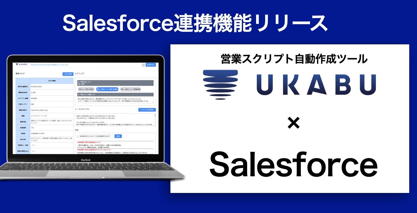 営業スクリプト自動作成ツール「UKABU(ウカブ)」が「Salesforce」との連携機能をリリース!ヒアリング結果や商談メモが自動入力可能に!
