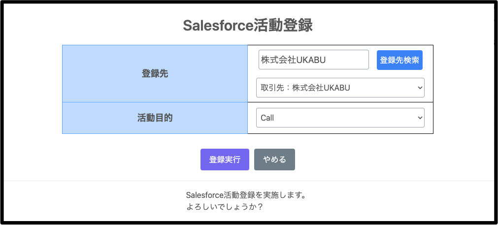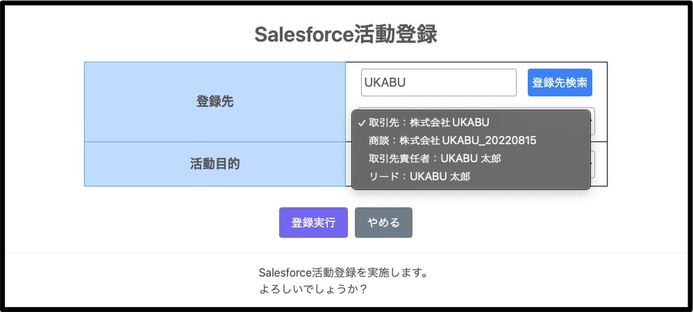 2.Salesforceに活動登録したい登録先を、取引先、商談、取引先責任者、リードなどから選択し、活動目的も選択し、「登録実行」ボタンを押す