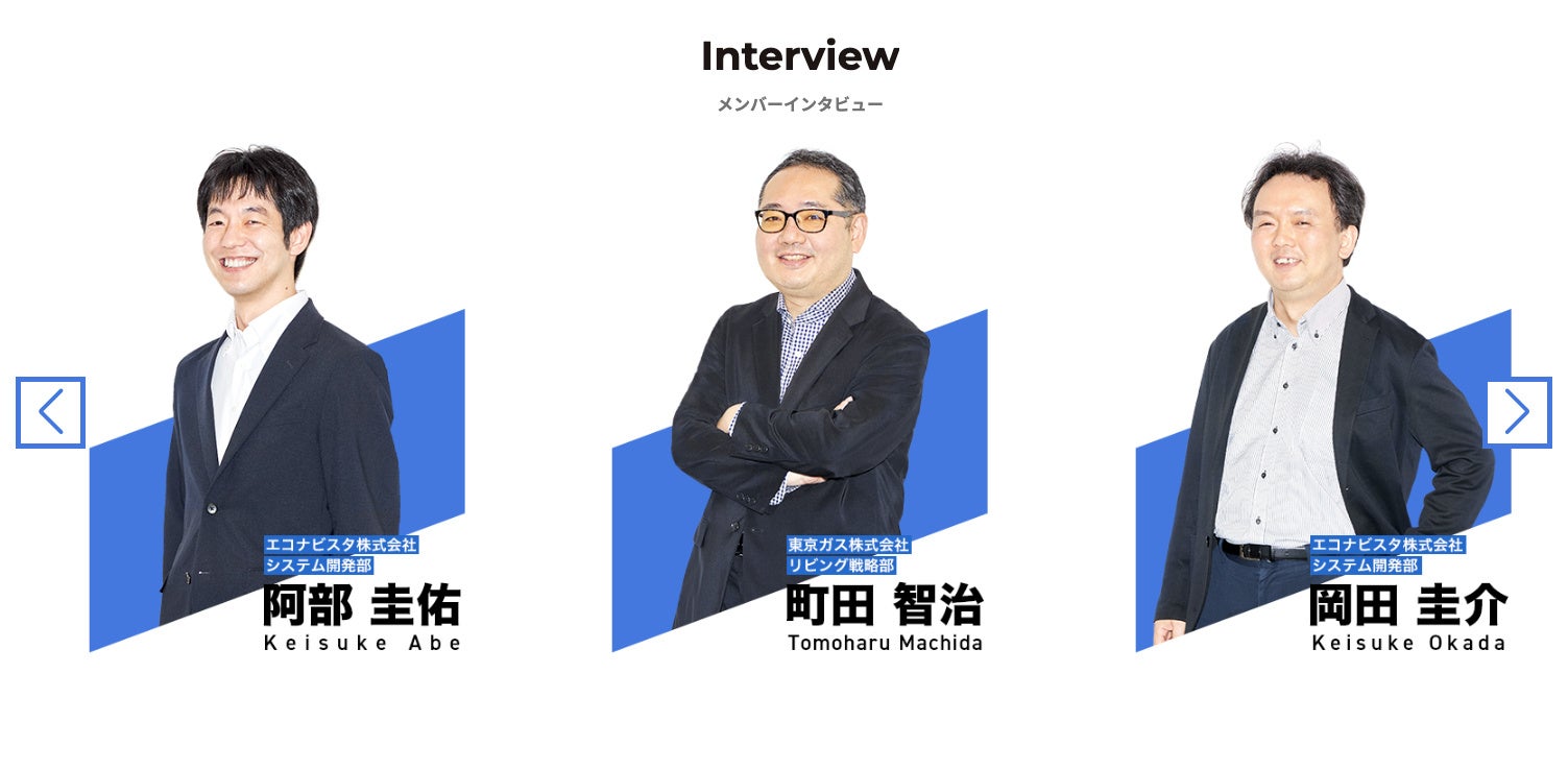 「なぜエイジテックなのか」「なぜ東京ガスと共同開発を行っているのか」等ビジネスの背景や、経営者としての信念などを、当社代表インタビューにて紹介しています。また、私たちのチームで働くことを自分事化してイメージできるよう、開発メンバーの個々の想いややりがいを始めとして、エコナビスタでしか得られない経験やキャリアについて記事化しました。