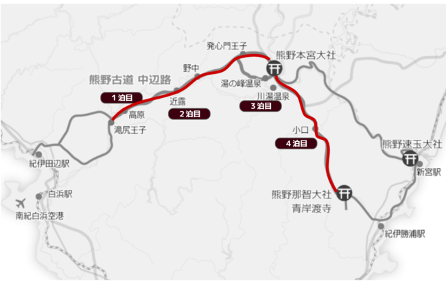 (3泊目の田辺市本宮町、4泊目の新宮市熊野川町の宿は、2022年中の開業を予定しています)