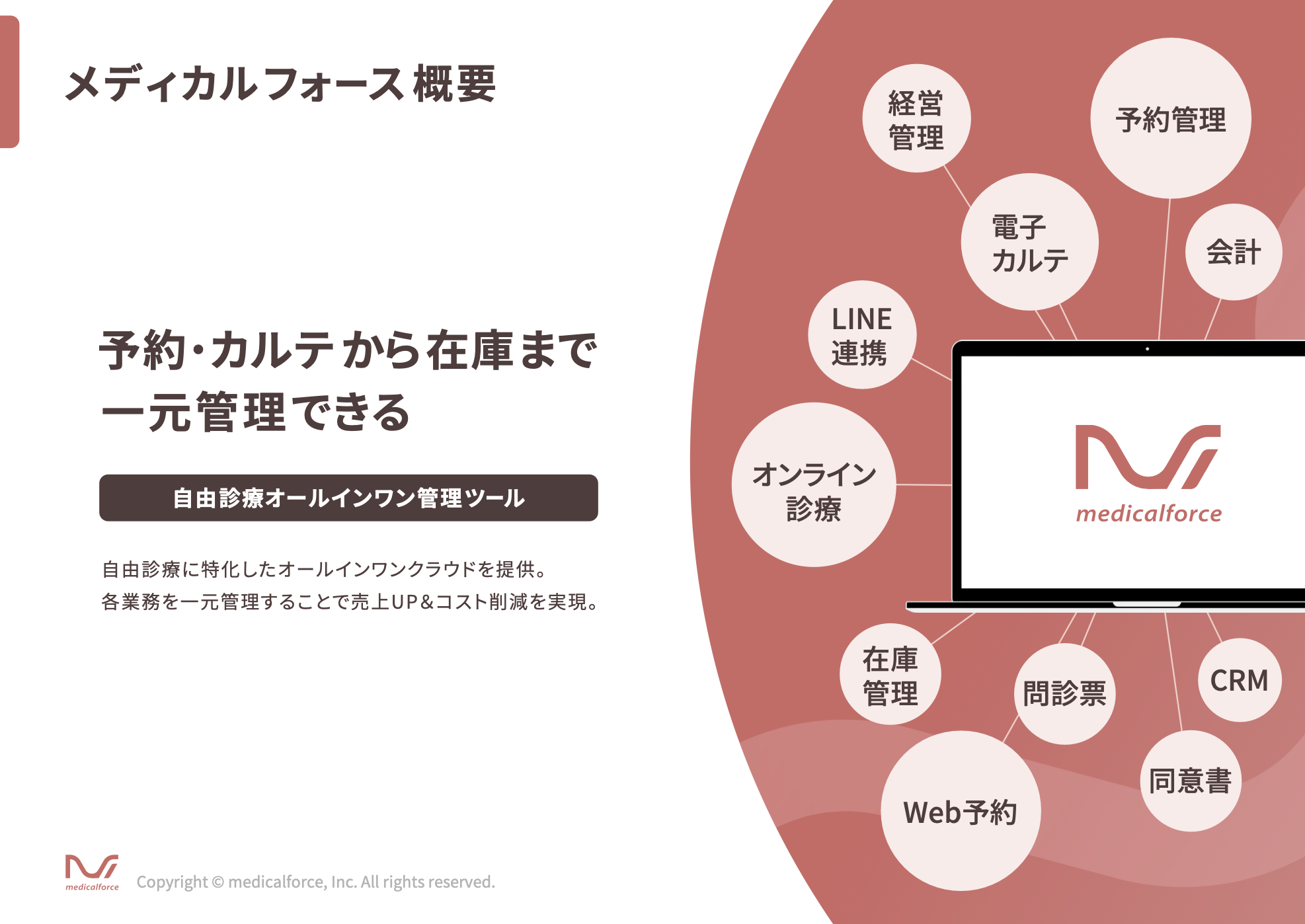 当社が開発する『medicalforce(メディカルフォース)』は、予約、問診、カルテ、会計などの日常現場業務、そして経営や集患の強化につながる経営管理ダッシュボードやCRM機能も搭載した自由診療向けオールインワンSaaSです。