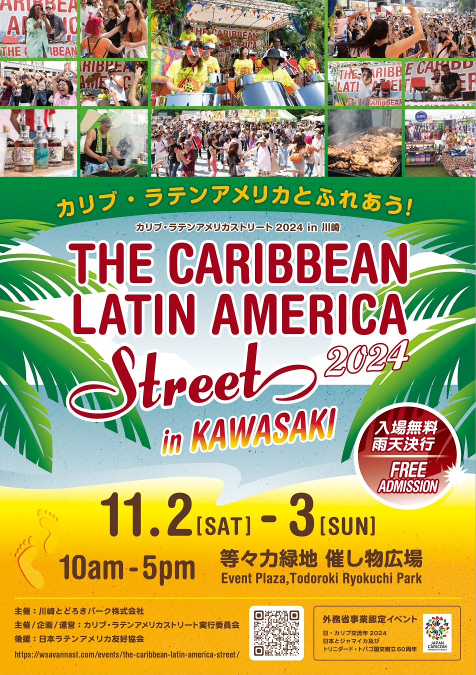 カリブ・ラテンアメリカストリート実行委員会(東京都目黒区 代表 森淳一郎)は、日本とカリブ及びラテンアメリカ諸国をテーマにした『カリブ・ラテンアメリカストリート in 川崎』を2024年11月2(土)・3(日)に川崎市中原区の等々力緑地 催し物広場で開催いたします。