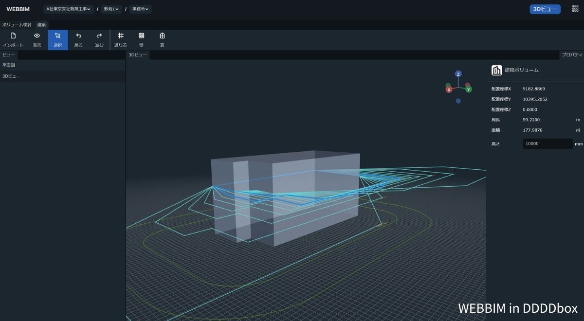 また、建築設計段階に応じた操作が容易なUIや、BIMの運用ルールを標準化できるデータ構造での開発を進めています。先行リリース版では、専用ソフトを使用することが一般的な「ボリューム検討」を機能として備えており、この時に作成した図面を次の建築設計段階でもそのまま利用できるため、図面の再作成は不要です。