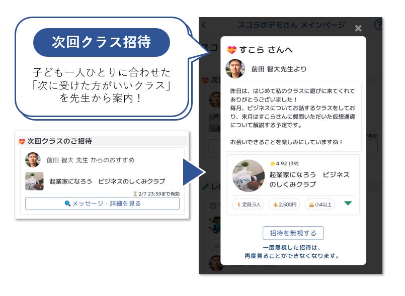 - 子どもの興味に合った先生を探せる検索機能と、興味を継続的に育てる次回クラス招待機能