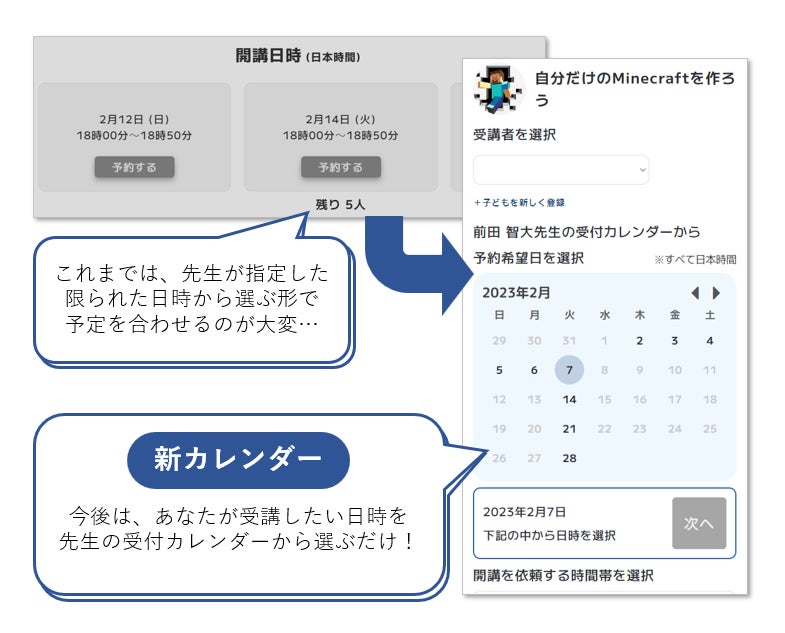 - 生徒の希望日時を選べる新カレンダー機能で、子どもの好奇心のタイミングを逃さない