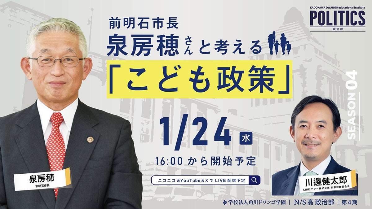 今回のテーマは、「前明石市長 泉 房穂さんと考える『こども政策』」です。泉氏は2011年~2023年に兵庫県の明石市長を務め、「こどもを核としたまちづくり」を掲げて子育て政策・少子化対策に注力してきました。高校生までの医療費や中学校の給食費など子育て関連5項目の「無料化」や、保育士の待遇改善と保育所待機児童の解消といった政策を次々に実行し、10年連続で明石市の人口増加を果たすなど、自治体改革に取り組みました。