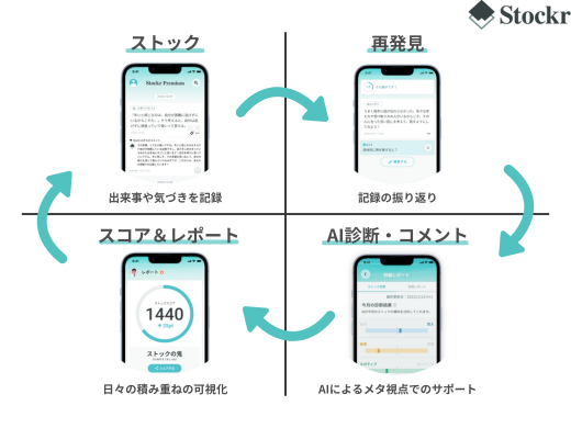 日々の思考や感情を記録する「ストック機能」、過去の記録から気づきを得る「再発見機能」、そしてAIがサポートする「ビジョン設定コーチング」「AIコメント」「価値観診断」、日々の積み重ねを可視化する「スコア&レポート機能」を提供し、自己理解と自信の積み上げを支援します。