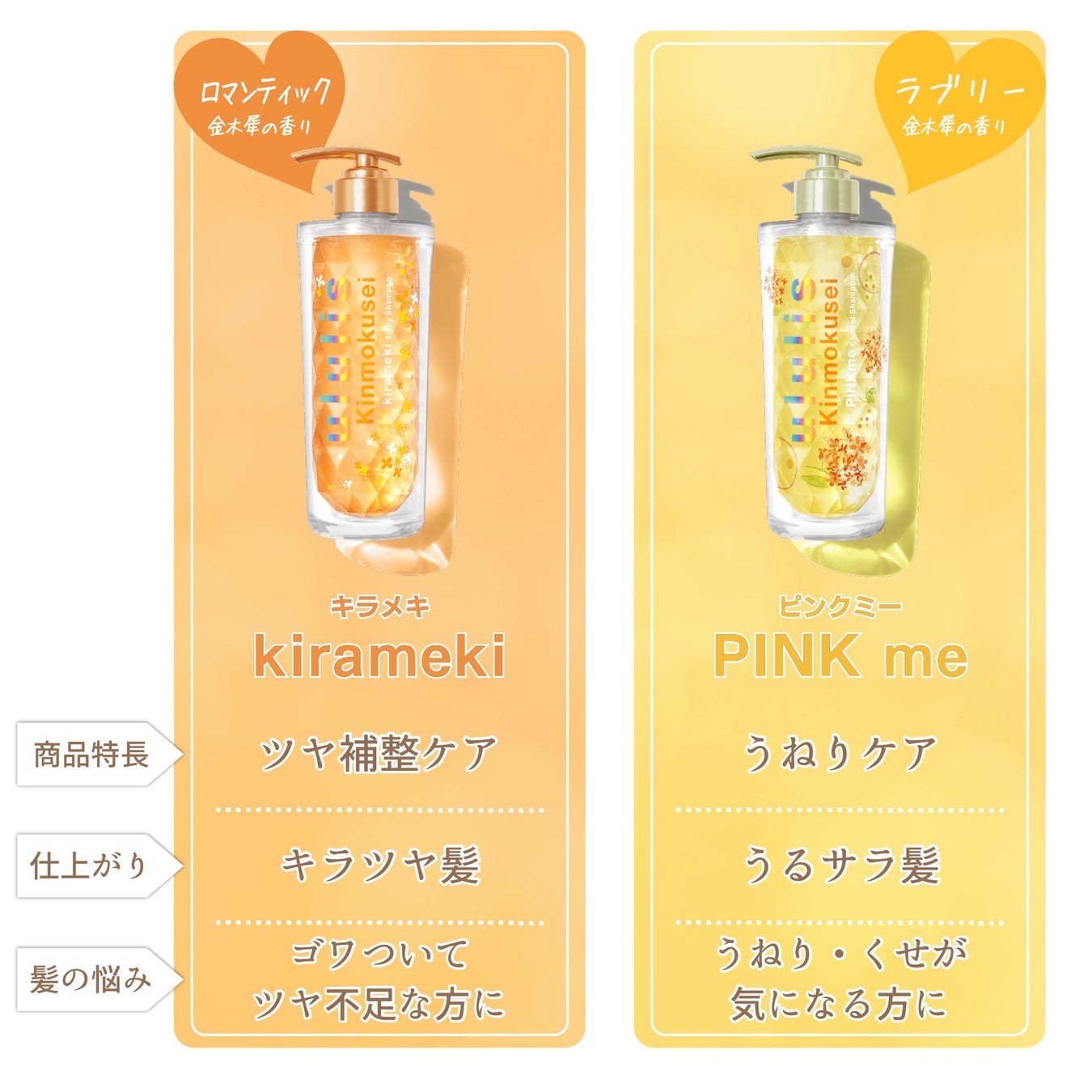 『ululis』は、髪を美容水※1で包み込み、芯までうるおいで満たします。ツヤ補整ケアタイプの『キンモクセイ キラメキ』はうるおいのあるキラツヤ髪へ。うねりケアタイプの『キンモクセイ ピンクミー 』は、まっすぐうるサラな仕上がりに。自身の髪の悩みやお好みに合わせてお選び頂けます。
