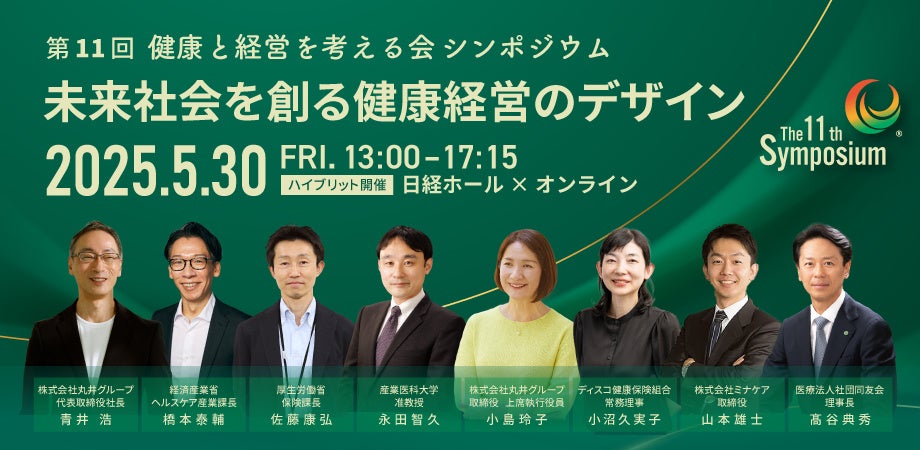 一般社団法人健康と経営を考える会(東京都文京区、代表理事:髙谷典秀・山本雄士)は、2013年に健康経営推進を目的として設立し、この度、2025年5月30日(金)に第11回シンポジウム「未来社会を創る健康経営のデザイン」をハイブリッド開催(東京都千代田区 日経ホール・Zoom Webinar)で開催いたします。基調講演に株式会社丸井グループ・青井浩 代表取締役社長 代表執行役員 CEO、第二部では「健康経営 これから10年・20年後を目指して」として、橋本泰輔ヘルスケア産業課長、佐藤康弘保険課長より施策について、永田・産業医大准教授には健康経営の投資対効果・エビデンスについて、ご講演いただきます。その後、二部講演者と、企業代表として小島玲子・丸井グループ取締役上席執行役員、保険者代表として小沼久実子・ディスコ健康保険組合常務理事をパネリスト、当会代表理事 山本雄士・株式会社ミナケア取締役をモデレーターとしてディスカッションを行います。