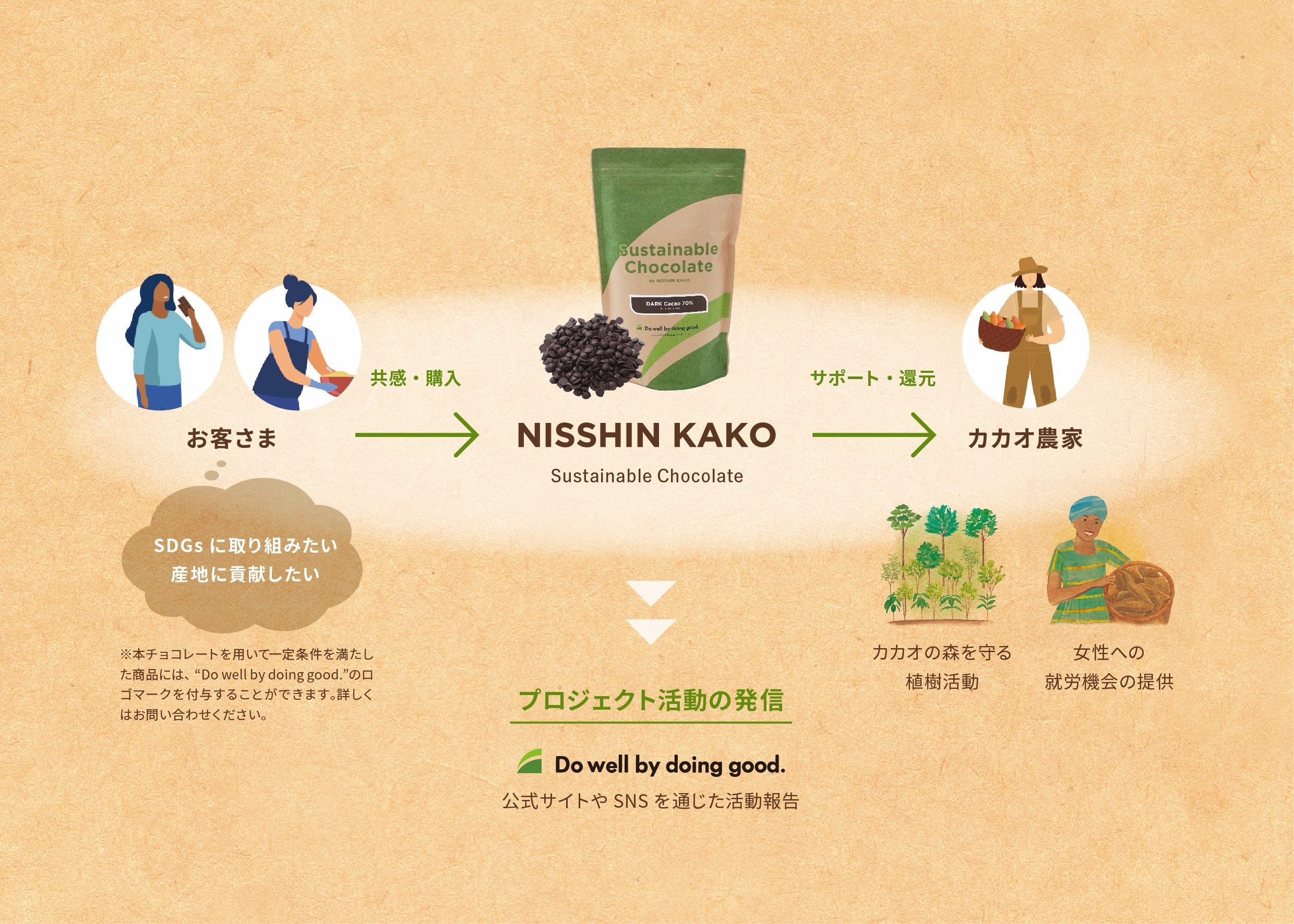 業務用チョコレートを国内製造する日新化工株式会社(本社:東京都中央区、代表取締役社長:直井広明 以下、日新化工)は、世界の食と農を取り巻く社会課題の解決を目指す「Do well by doing good.」(=いいことをして世界と社会をよくしていこう)を体現したサステナブルチョコレートの製造販売を通じて活動を広めています。その取り組みに賛同したサステナブルなスイーツやチョコレート、パン、コーヒーやワインなどの商品とブランドを一同に集め紹介・販売するイベント『サステナブル マルシェ2023』を4月21日より期間限定で開催します。