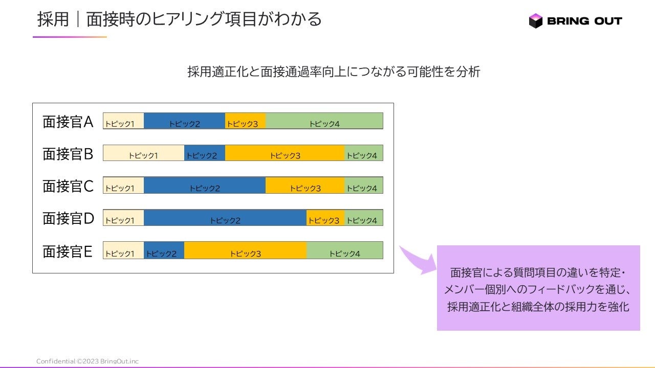 これまでは録画データを見直す時間と、その分析が十分に確保されていませんでした。Bring Out for HRの導入により、過去の面接の録画データを自動要約し、解析することで、このデータを有効活用できるようになります。