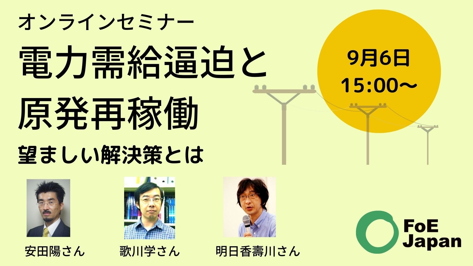 国際環境NGO FoE Japanは、9月6日、電力需給逼迫の原因と対策について学び、原発の稼働との関係について考えるためのオンラインセミナーを開催します。