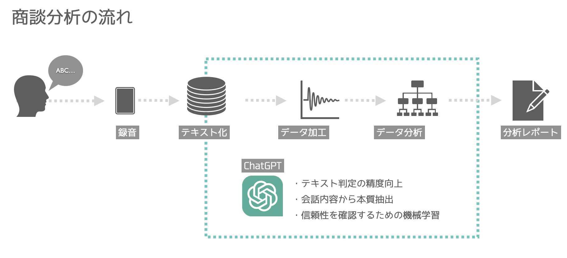 店舗での営業は簡単なマニュアルで運用する企業もありますが、大半は属人的な営業スタイルになり、品質の向上や内容の平準化が難しいという課題がありました。この課題に対して、商談を録音し当社のシステムで解析することで、商談内容の過不足や言葉遣い、速度や話題の割合や順番など様々な観点から課題と改善策を提供することができるようになりました。