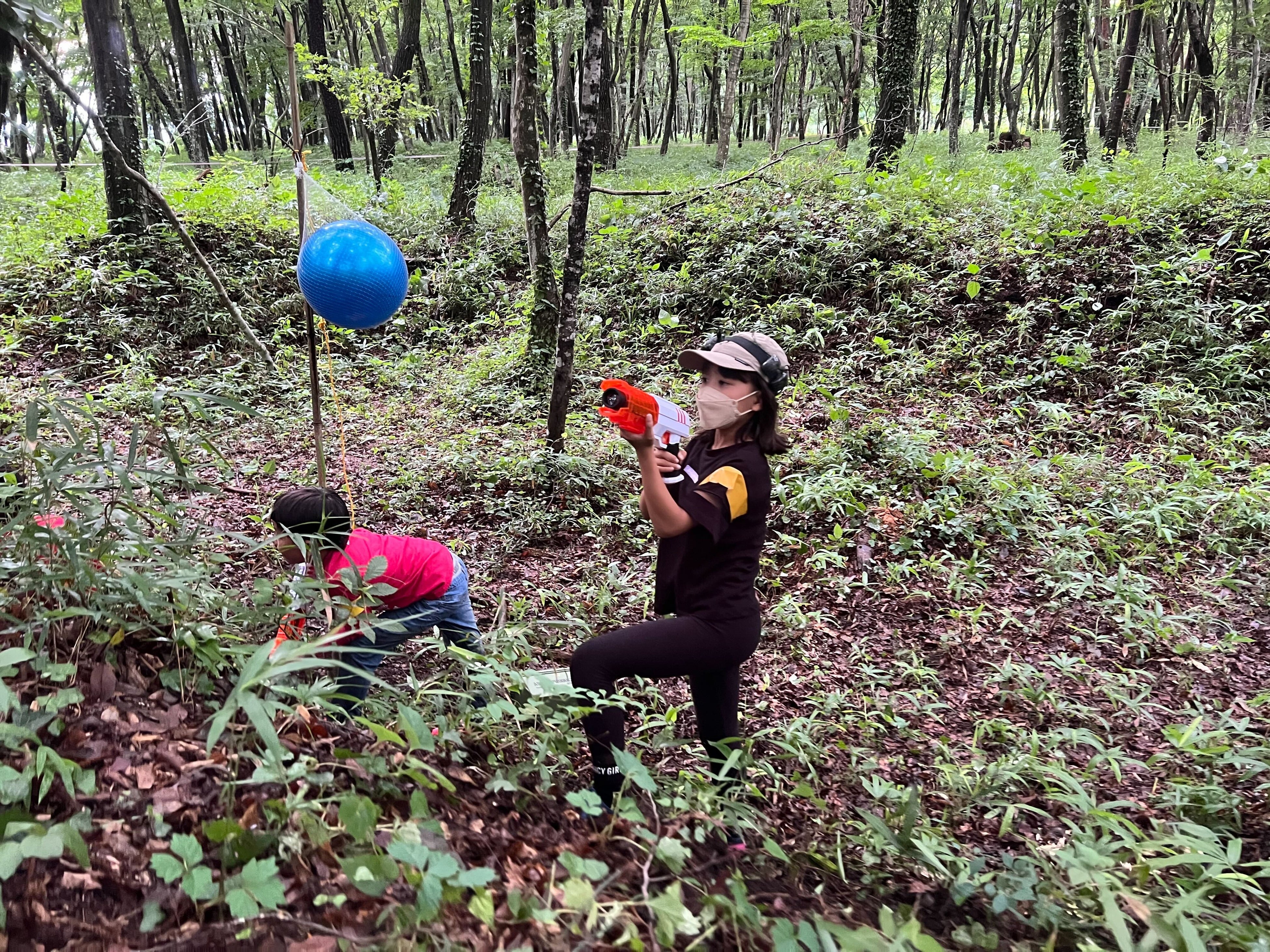 一例ですが、森林に囲まれたキャンプ場で開催されたワーケーションイベントの森林レクリエーションのコンテンツを請け負い、「親子シューティングかくれんぼ」を行いました。