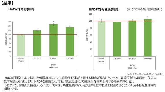 試験の結果、天然精油には角化細胞、毛乳頭細胞ともに増殖させる効果が見られたことから、育毛促進作用が期待されます。