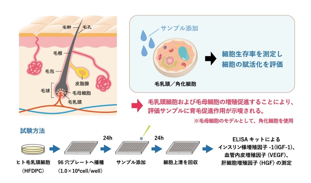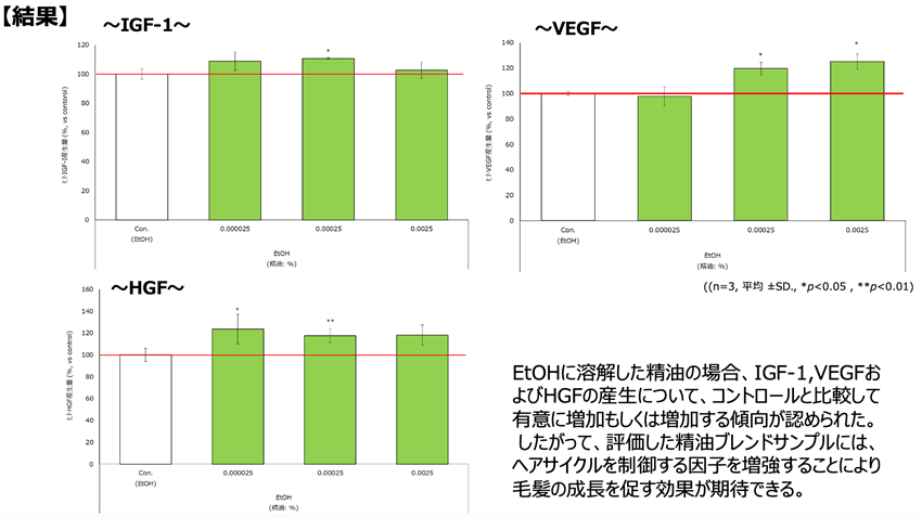 毛乳頭細胞が毛母細胞に増殖するように指令を出す際、毛乳頭細胞でインスリン様増殖因子-1(IGF-1), 血管内皮増殖因子(VEGF), 肝細胞増殖因子(HGF), 線維芽細胞増殖因子(FGF)といった細胞増殖因子が産生され、毛母細胞の成長を促すことで毛母細胞が増殖すると考えられています。そこで、天然精油が毛乳頭細胞内の細胞増殖因子を産生する効果があるか、試験を行いました。