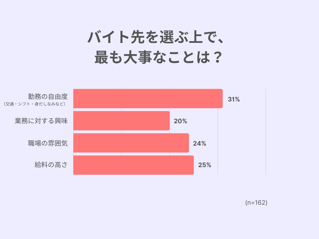 アルバイト職場を選ぶ最も重要な決め手について、約3割のユーザーが交通・身だしなみ等を含む勤務の自由度(31%)だと表明しました。給料の高さ(25%)と職場の雰囲気(24%)が同程度の割合を獲得し、業務に対する興味(20%)が最下位となりました。
