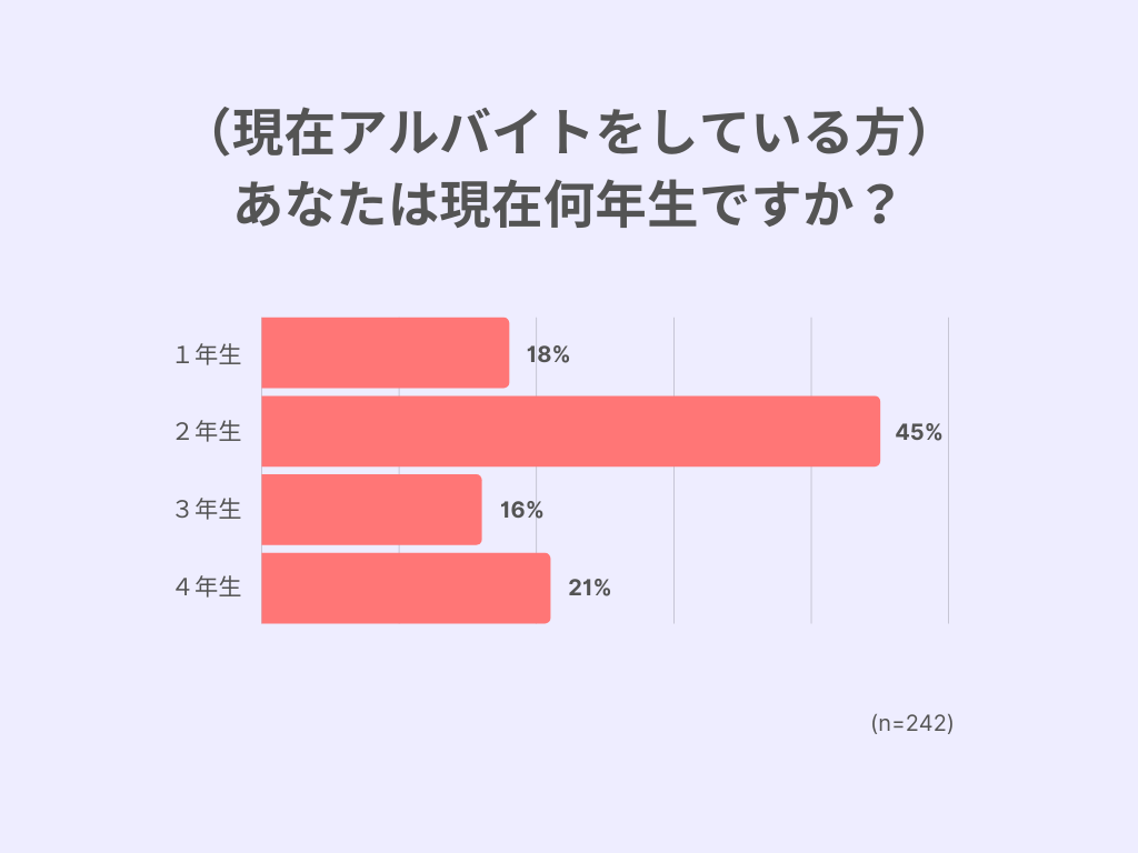 ・アルバイトをしている大学生の中では2年生(45%)が最も多い
