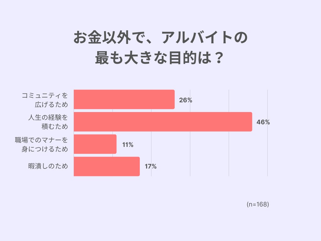 お金以外に限るアルバイトの目的について、約半数の大学生が人生の経験を積むため(46%)にアルバイトをすることが明らかになりました。また、2位には「コミュニティを広げるため(31%)」がランクインし、「暇潰しのため(17%)」および「職場でのマナーを身につけるため(11%)」が下位を占めました。