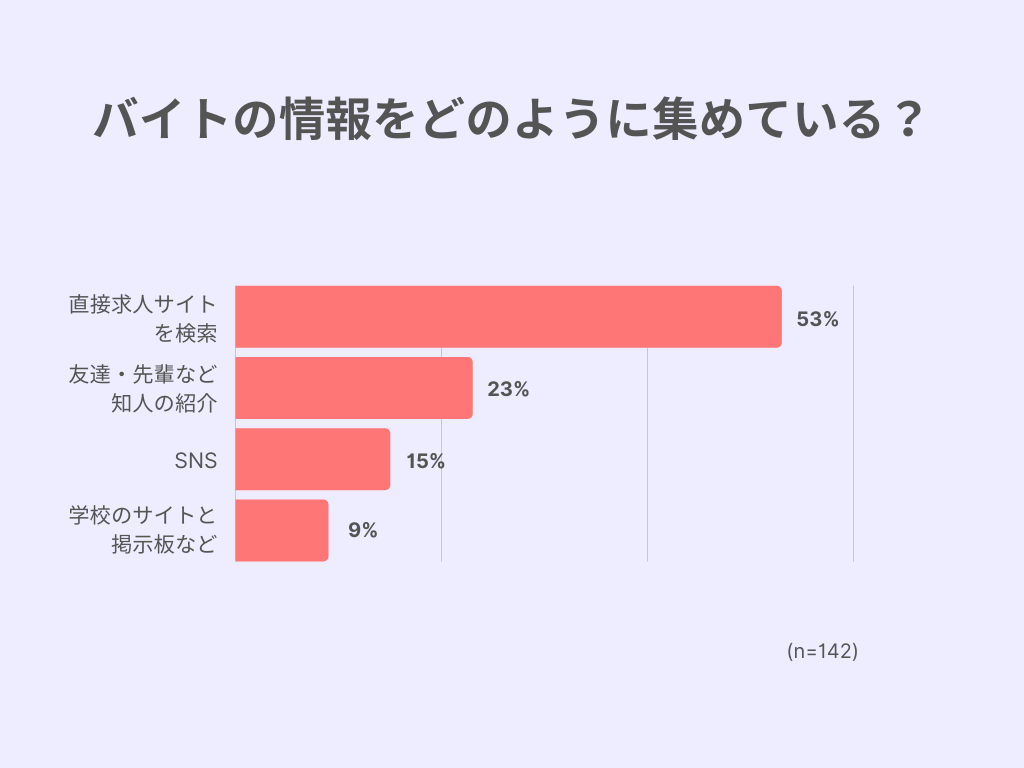 ・アルバイトの情報収集について、直接求人サイトを検索する(53%)ことが最も多く、2位は友達・先輩などの知人の紹介(23%)