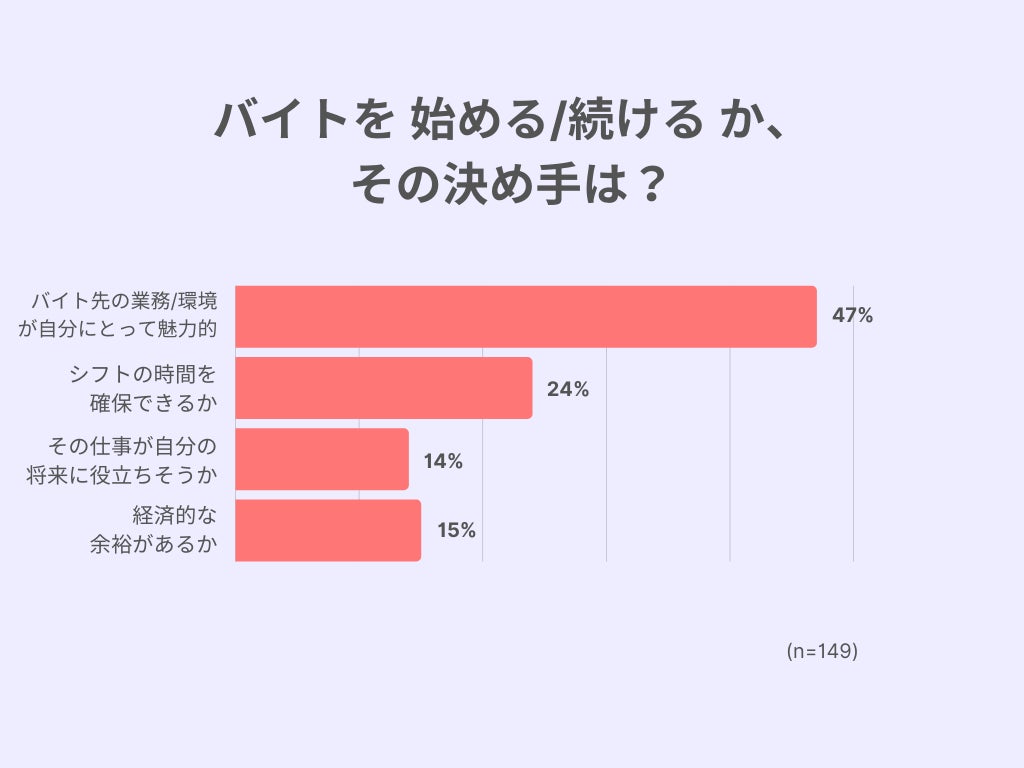 約半数の学生が業務・職場環境の魅力(47%)を「アルバイトを始める/続ける」への決め手とすることが判明し、次にシフトの時間確保(24%)がランクインしました。また、経済的な余裕(15%)・自分の将来に役立つ仕事(14%)が下位2位を占めました。