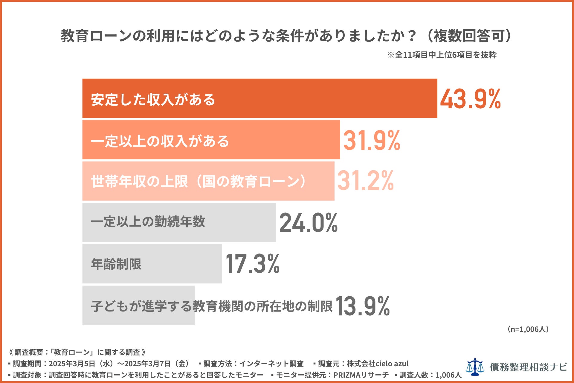 そこで、「教育ローンの利用にはどのような条件がありましたか?(複数回答可)」と質問したところ、『安定した収入がある(43.9%)』と回答した方が最も多く、次いで『一定以上の収入がある(31.9%)』『世帯年収の上限(国の教育ローン)(31.2%)』となりました。
